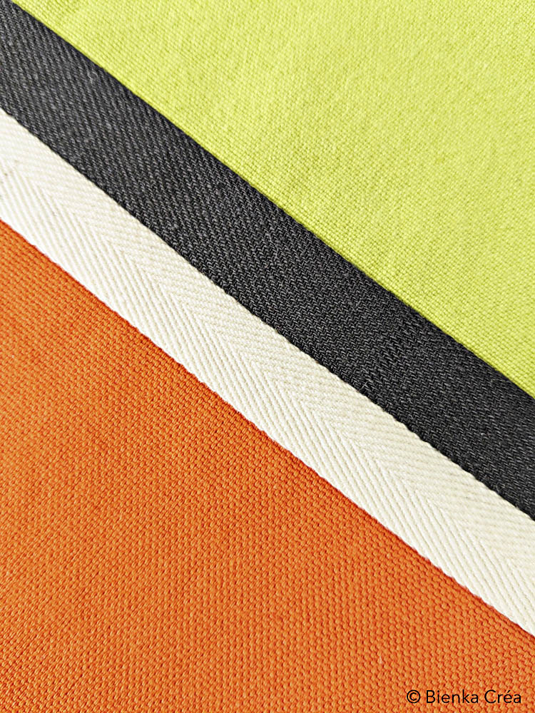 Dessous de plat rond fait avec soin à la main à partir de tissus chinés et valorisés : assemblage de tissus en coton orange et vert, sergé de coton noir et crème. La pièce est isolée par du molleton thermique.
