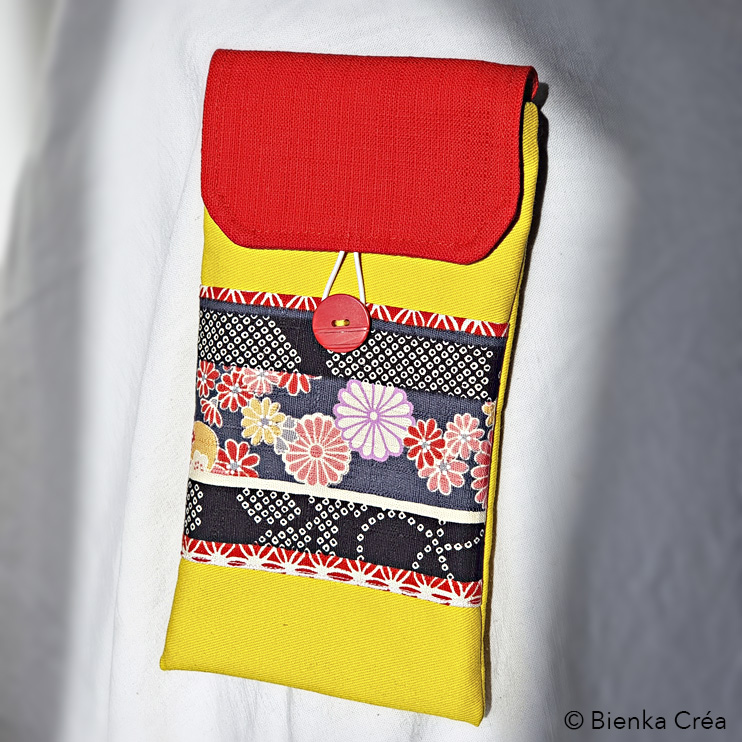 Étui-pochette à rabat doublé fabriqué artisanalement en France à partir de tissus chinés et valorisés.