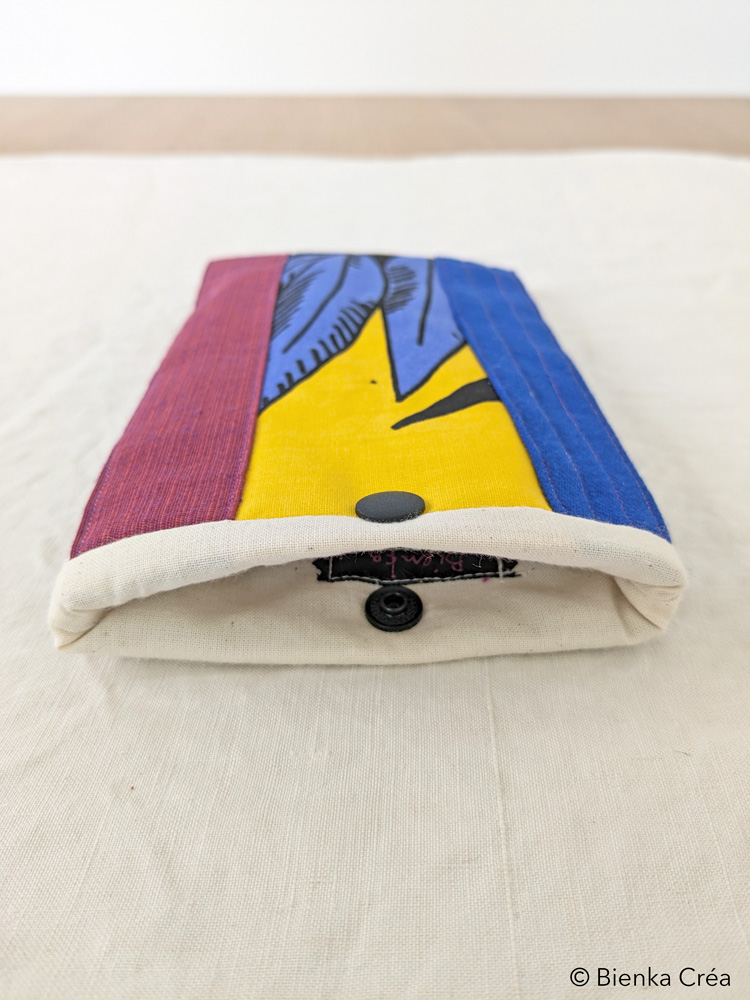Étui-pochette molletonné et doublé fabriqué en France artisanalement à partir de tissus chinés et valorisés.