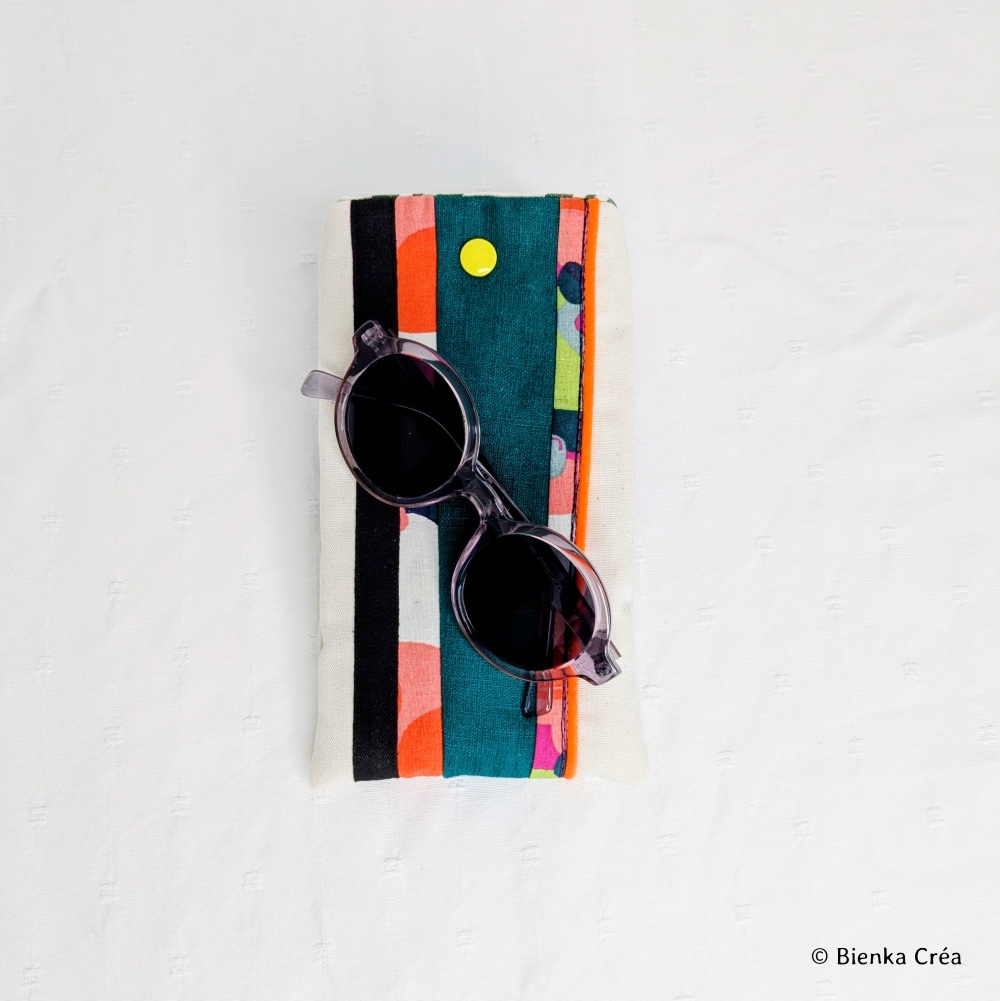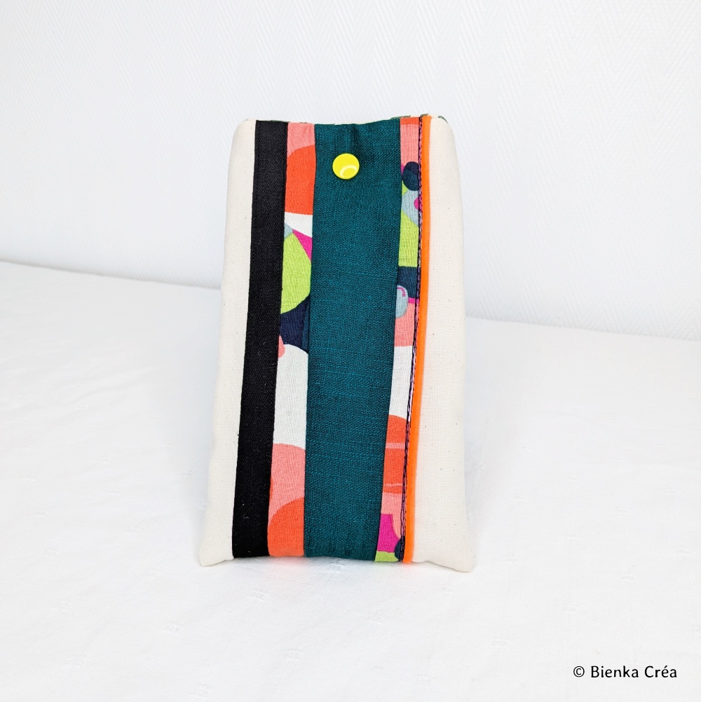 Etui pochette molletonné et doublé fait avec soin à la main à partir de tissus chinés et valorisés. Téléphones, smartphones, lunettes, papiers, jeux de cartes et autres trésors s’y sentiront bien au chaud. Cette pièce unique se compose d’un assemblage mixant plusieurs extraits de tissus : coton crème et bande patchwork bordée d’un passepoil orange fluo. La doublure est un coton écru et vert olive. Fermeture par bouton pression jaune.