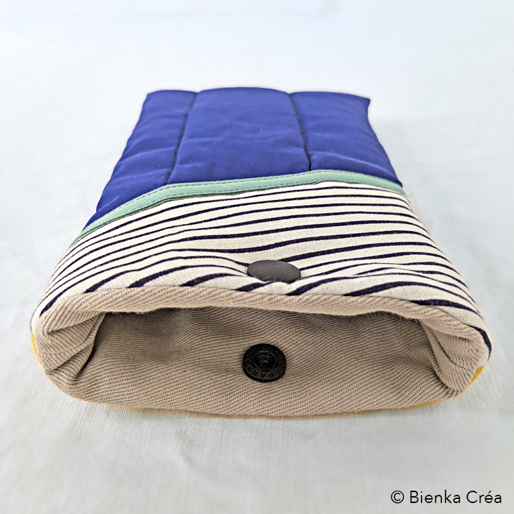 Cette pièce unique se compose d’un assemblage mixant plusieurs extraits de tissus : tissu matelassé bleu indigo (coton et polyester), bandes de coton jaune, orange et écru à rayures noires. La doublure est un coton épais couleur taupe. Fermeture par bouton pression noir. Dimensions : 21 * 11,5 cm.