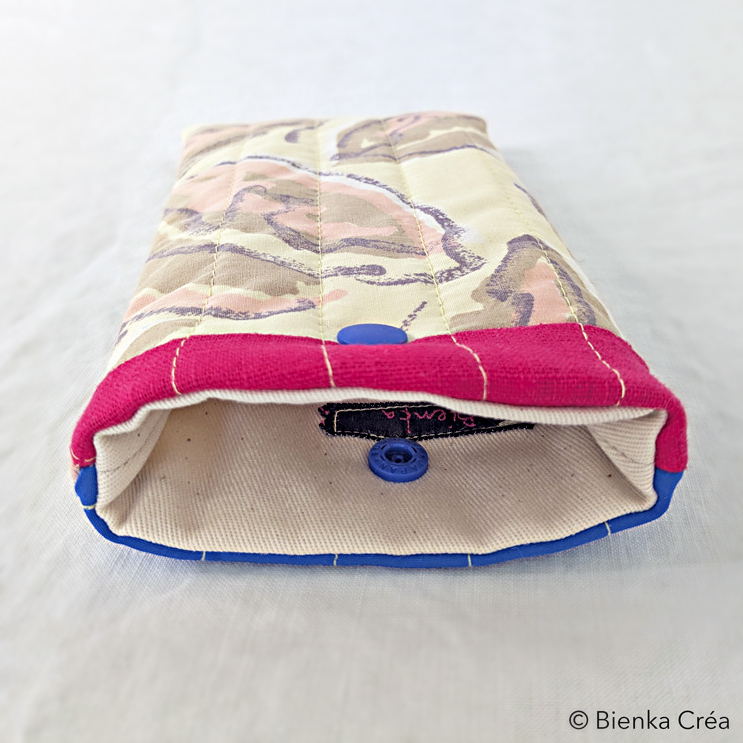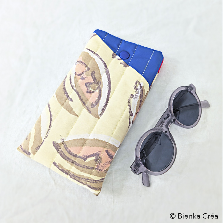 Étui-pochette matelassé et doublé fabriqué en France artisanalement à partir de tissus chinés et valorisés.