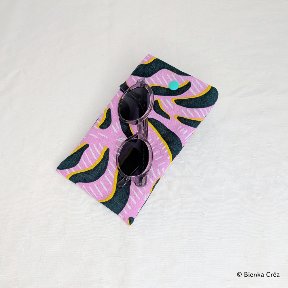 Etui pochette molletonné et doublé fait avec soin à la main à partir de tissus chinés et valorisés. Téléphones, smartphones, lunettes, papiers, jeux de cartes et autres trésors s’y sentiront bien au chaud. Cette pièce unique est composée d’un coton graphique rose, noir, jaune et blanc. La doublure est un coton jaune vif. Fermeture par bouton pression vert.