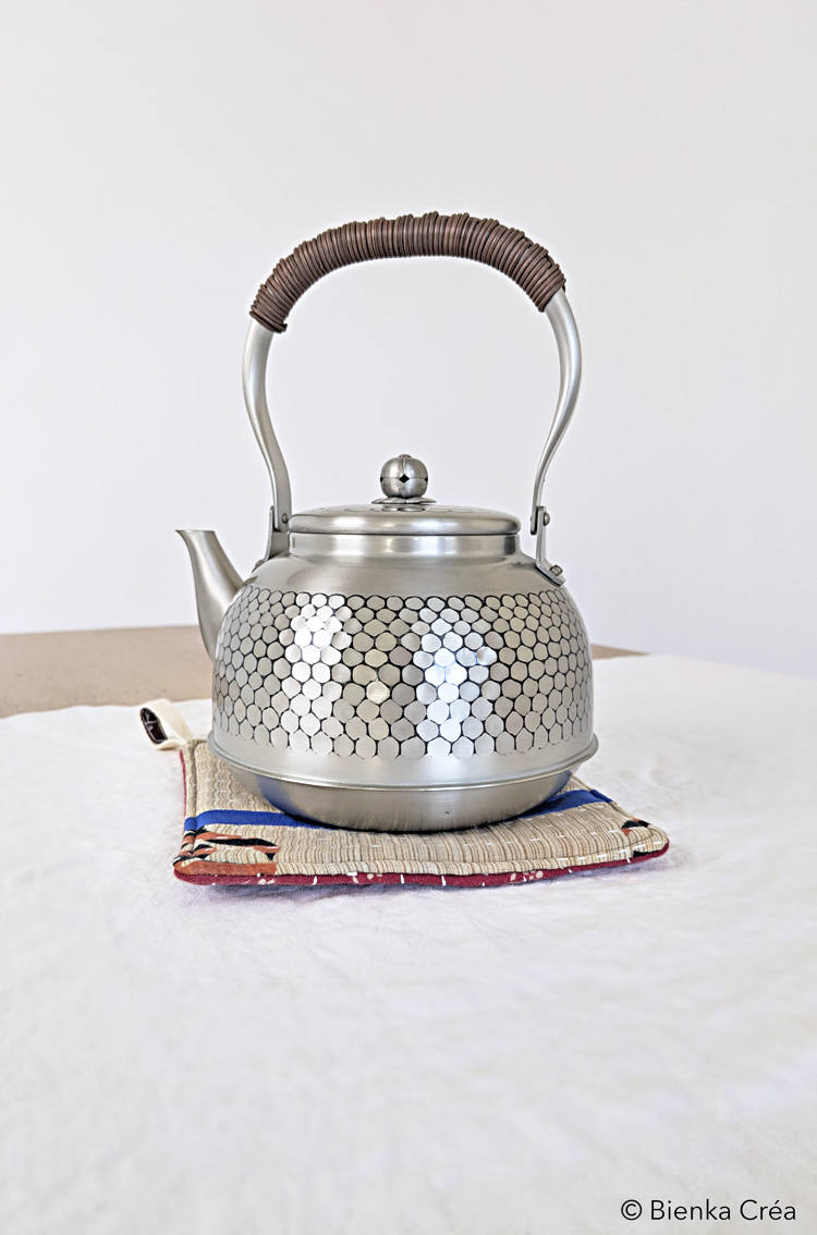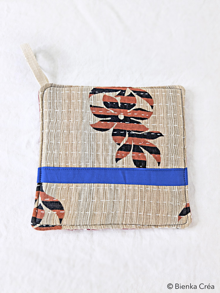 Manique de cuisine fabriquée en France à la main à partir de tissus chinés et valorisés : un côté avec un tissu batik beige à fleurs et bande de coton bleu, de l’autre un tissu rouge à fleurs blanches. Pas de panique avec cette manique doublement isolée par du molleton thermique.