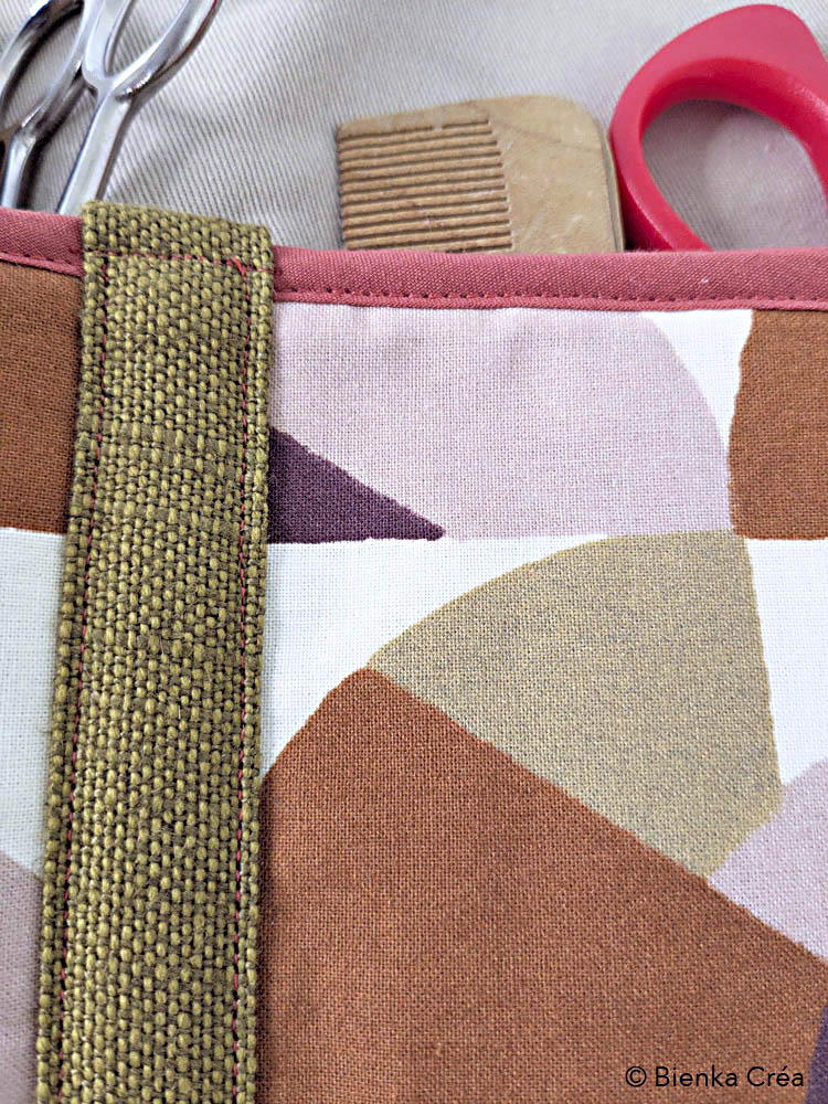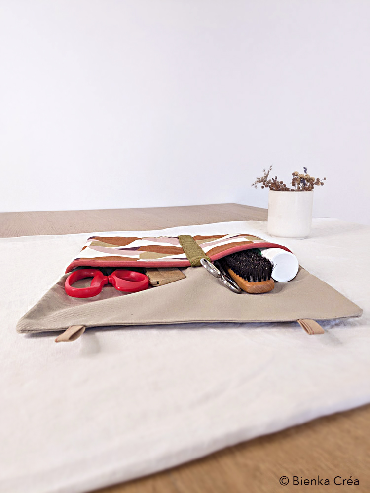 Organisateur mural doublé et molletonné fabriqué en France à partir de tissus chinés et valorisés : coton à motifs géométriques marron et rose, coton épais taupe et molleton blanc. Pratique et esthétique, il s’accroche au mur de la cuisine, de la salle de bain, du bureau, de la chambre, du van aménagé et accueille, au choix, ustensiles de cuisine, outils de loisirs créatifs, produits d’hygiène ainsi que les doudous des tout-petits.