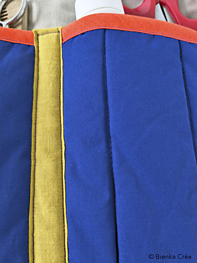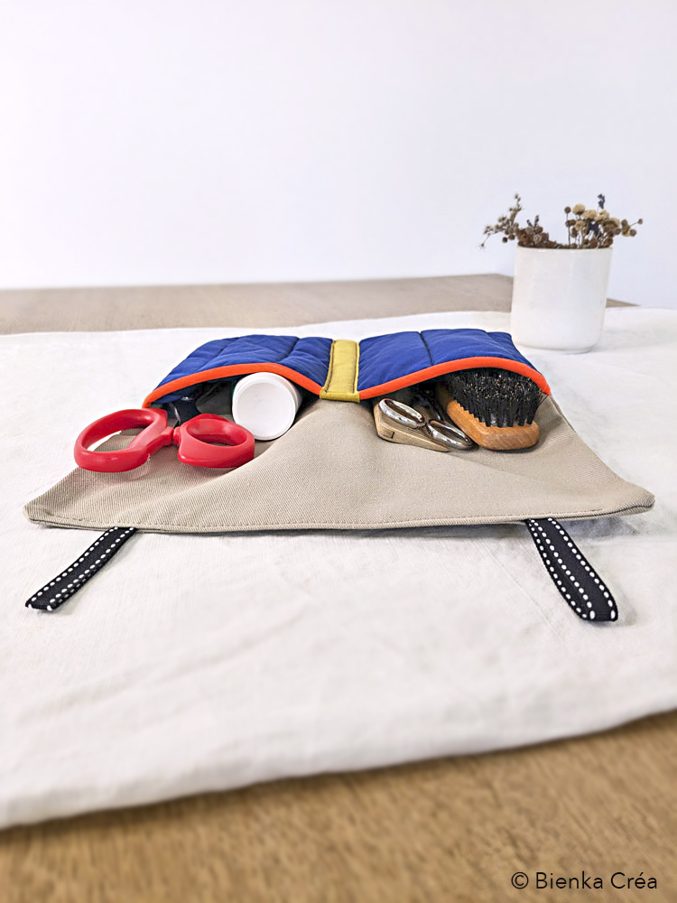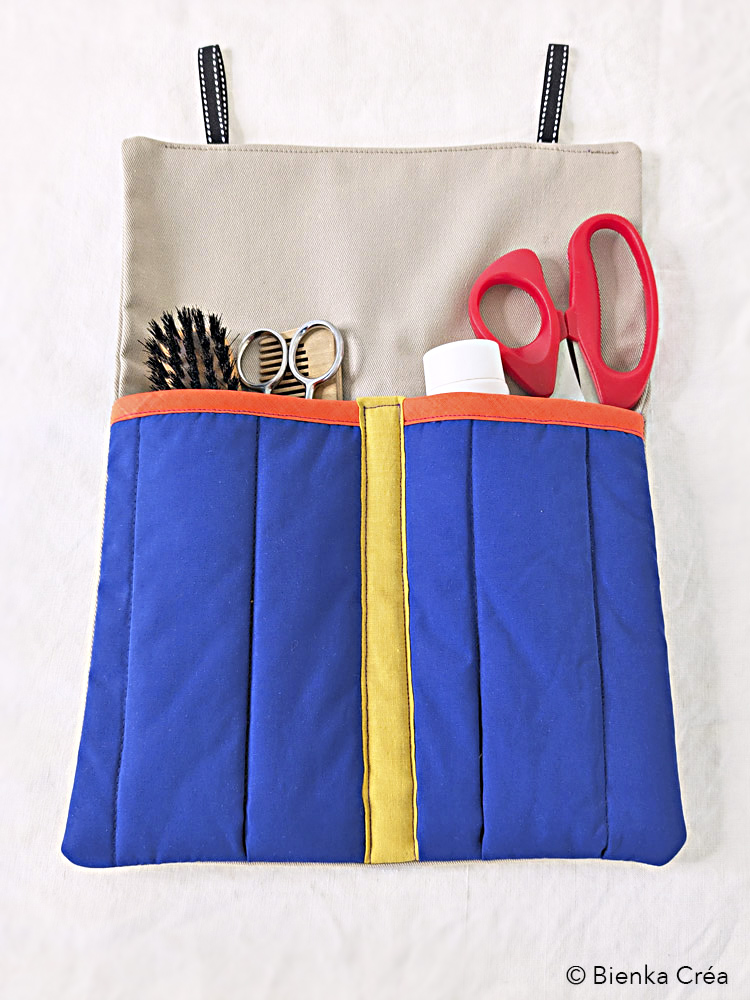 Organisateur mural doublé et matelassé fabriqué en France à partir de tissus recyclés et valorisés : coton et polyester bleu indigo et coton épais taupe. Pratique et esthétique, il s’accroche au mur de la cuisine, de la salle de bain, du bureau, de la chambre, du van aménagé et accueille, au choix, ustensiles de cuisine, outils de loisirs créatifs, produits d’hygiène ainsi que les doudous des tout-petits.