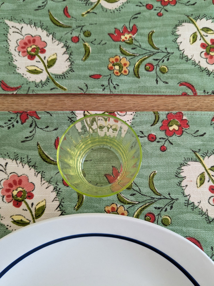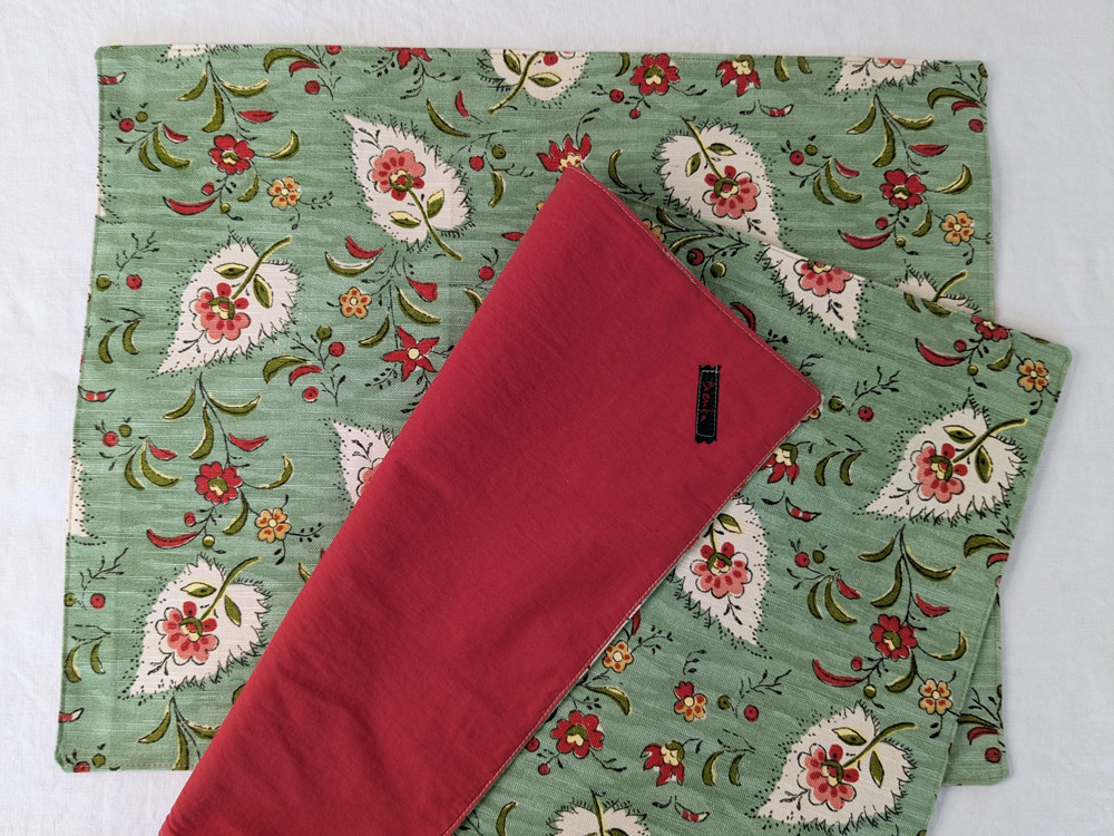 Paire de sets de table doublés réalisée avec soin à la main en France à partir de tissus chinés et valorisés : coton vert vintage à fleurs, motif cachemire.